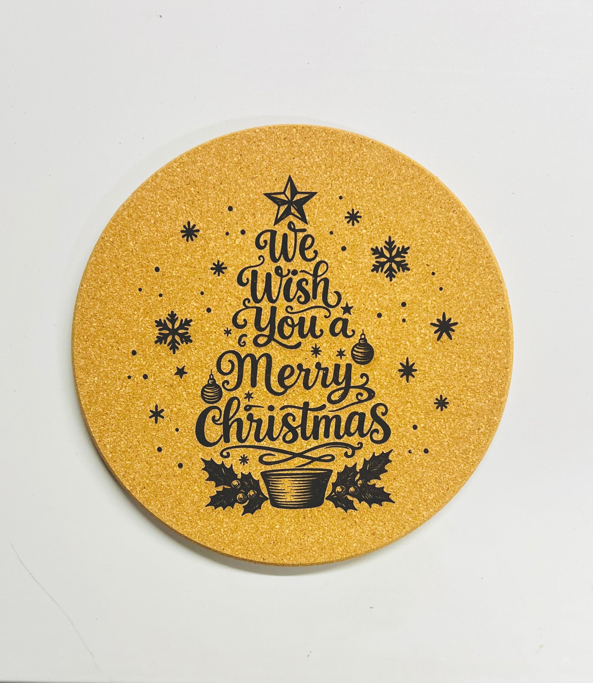 These charming engraved cork trivets blend practical protection with festive flair.